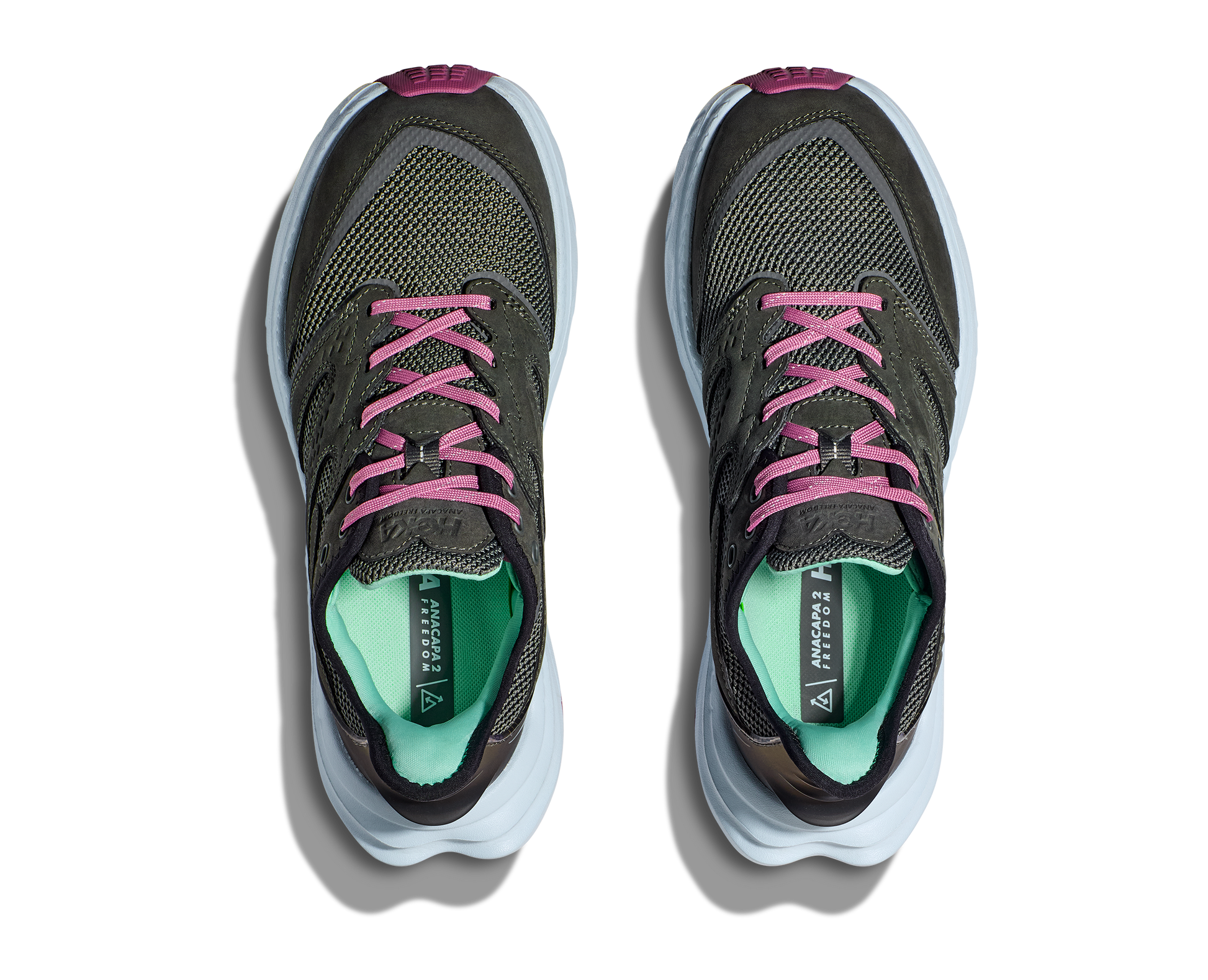 A slip-on designed for simple on-and-off, the Anacapa 2 Freedom paves the way for adventuring outdoors. A specially designed heel flexes and springs back for easy entry, working with the integrated tongue to make sliding in a breeze. HOKA geometry and a Vibram® Megagrip outsole keep this hiker adventure-ready while sustainable materials like 55% recycled polyester meshes, a soy-based PU sockliner, and 30% sugarcane EVA help it tread more lightly.