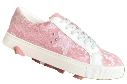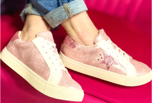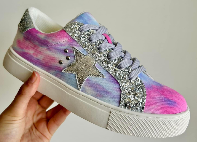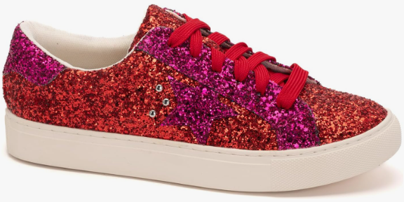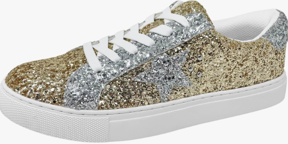 These adorable sneakers will step up any casual outfit! They feature a glitter and faux leather upper with a cushioned, silver heel, lace up design, silver star and stud accents, cushioned footbed, and an off white 1" outsole. Comfy enough for all day wear, throw them on for a shopping day with the girls or running errands!