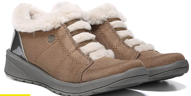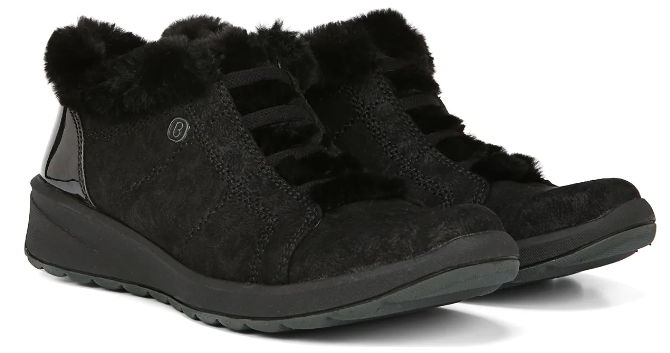 - Stretch fabric upper with faux fur lining in a casual bootie style with a round toe
