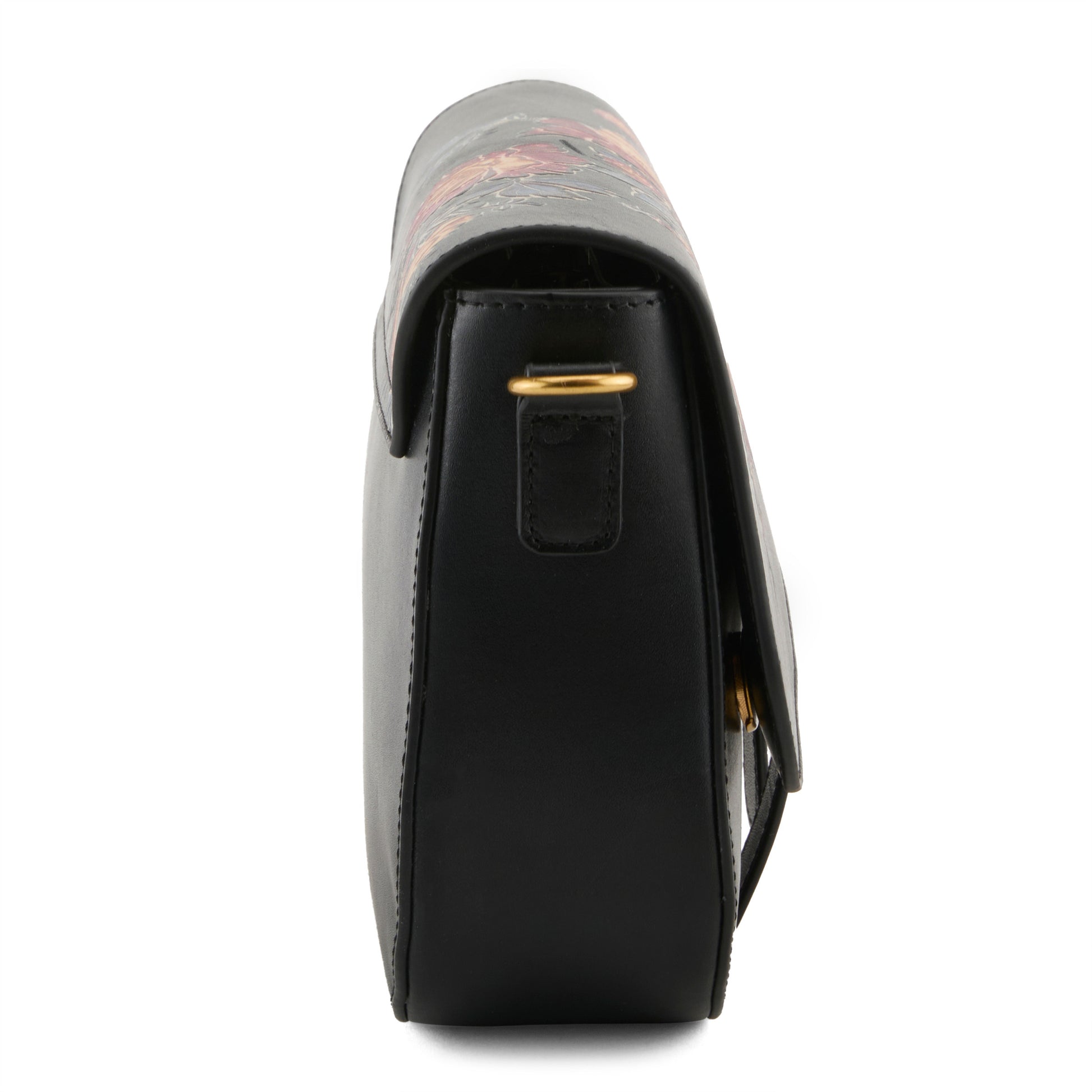 L'Artiste Style: HB-Canter- Hand painted genuine leather with a Rockstar vibe is what makes HB-Canter one of our favorites! Curvy and contoured, this English inspired saddle design has both a zip top closure and a floral painted double snap flap for added safekeeping with undeniable beauty. A single compartment interior features cotton twill lining with opposite wall pockets. Cool vibed woven 2 tone removable and adjustable guitar style strap, will hang securely on your shoulder or comfortably across your body. Coordinate with one of our many matching handpainted boots or shoes in the same gorgeous carved and colored floral designs for that extra WOW factor!