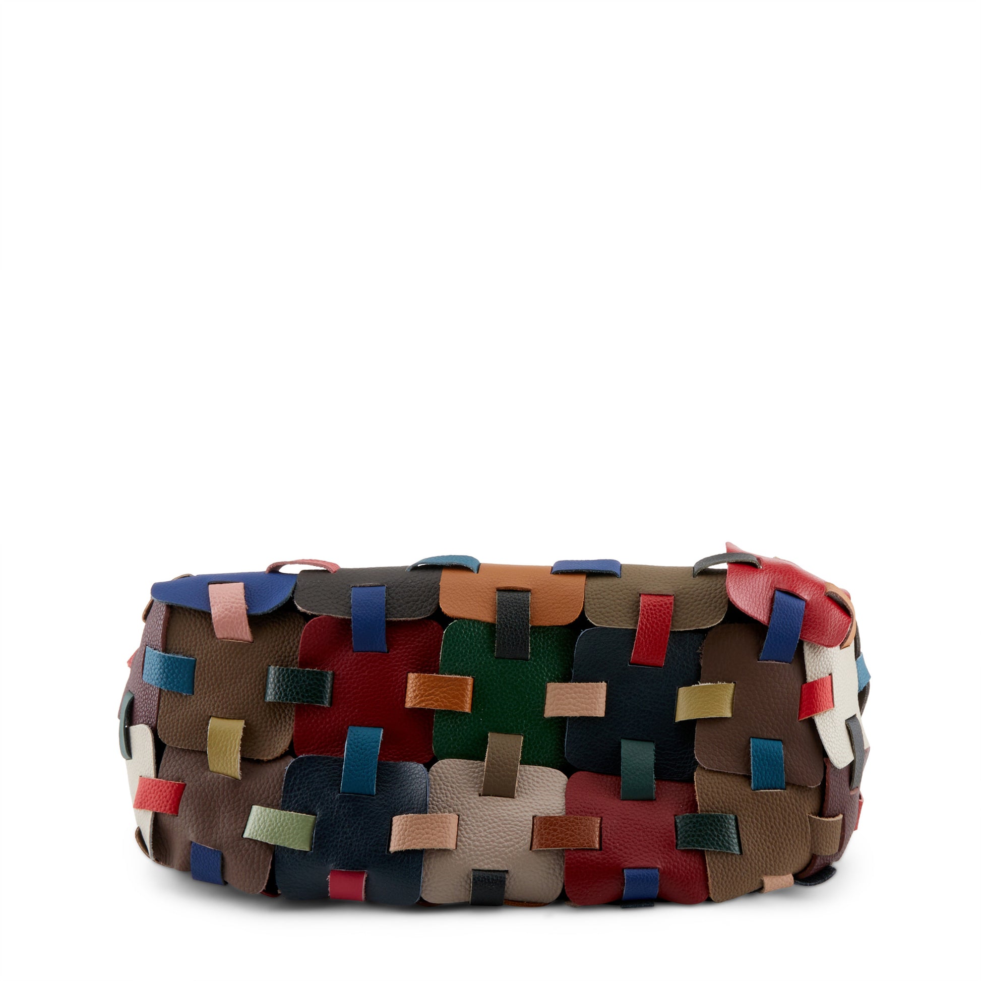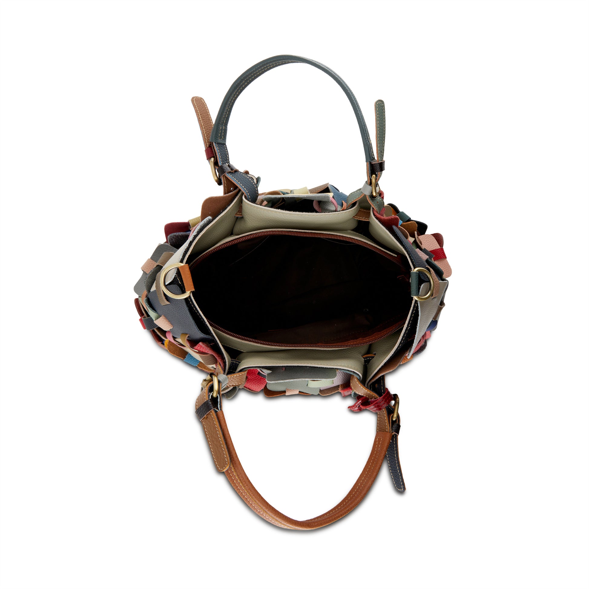 L'Artiste Style HB-Quilted: Genuine leather 3" multi colored squares are all over looped and attached with contrasting leather strips from top to bottom/ front to back. Each unique and colorful tote can be worn hand held with adjustable canvas backed flat leather straps or cross body for hands free convenience with our adjustable and removable leather/canvas combo'd shoulder strap. This large supple leather bag immediately molds to the contours of your body and will be a welcome addition in your daily life and the perfect carryon for your plane, train and auto trips as well. Zip top single compartment with inside wall and zipper storage pouches for easy access to smaller items. Antique brass hardware. Cottony storage dust bag included. Imported..