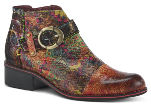 This western-inspired boot features a stylish brushed and burnished toe box and a convenient zipper closure for easy on and off. The boot’s abstract hand-painted upper is accented with a decorative buckle and rainbow stitching, adding a pop of color and a touch of whimsy to the design. Overall, this boot is a perfect combination of fashion and function, ideal for those who want to make a statement with their footwear.
