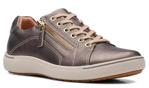 Stay light on your feet with the Nalle Lace. Supple bronze metallic leather uppers bring sports-inspired style to Clarks' iconic craftmanship, resulting in a contemporary sneaker that's ideal for a modern life. Our supportive Contour Cushion footbed combines with a high-grip rubber sole for underfoot comfort on those busy days.
