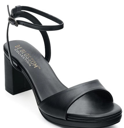 NELLY-48 Ankle Strap Open Toe Low Block Heels. These low platform heels feature adjustable buckle straps and cushioned insole support for all-day comfort.