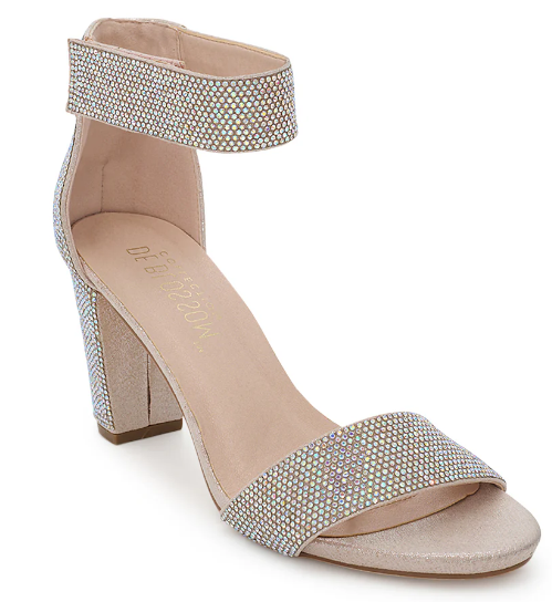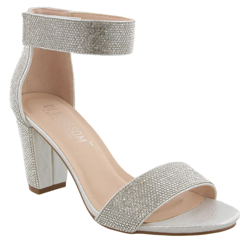 These heels are to die for! The entire shoe is adorned with glittering gemstones that catch the light in a stunning way. This shoe features a strap across the toe and an ankle strap that adjusts with a piece of velcro. The 3 inch heel finishes off this look perfectly. This shoe would be the perfect addition to any formal look