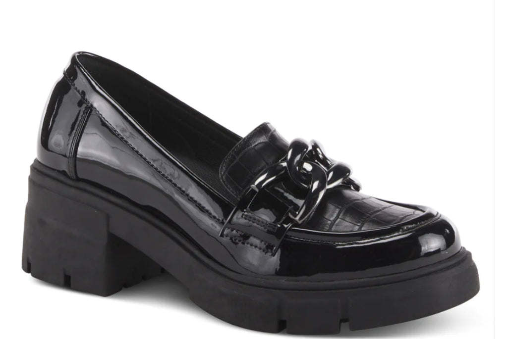 These faux croco material loafer with chain detailing is a trendy and fashionable footwear option that combines classic design with an edgy twist. The industrial flair brought by the chain detailing adds a unique and eye-catching detail, while the lug sole and block heel provide both stability and durability. The classical silhouette of the loafer makes it a versatile choice that can be dressed up or down, making it a great addition to any wardrobe.
