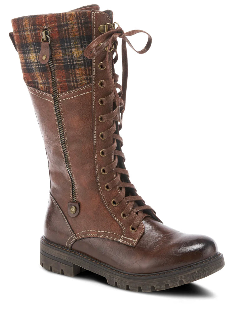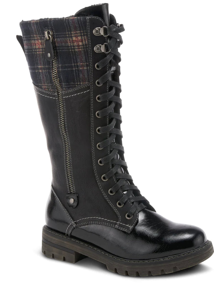 Outstanding lace-up boot starring a complementary plaid around the top of the shaft and decorative outside zipper on a low lug sole.