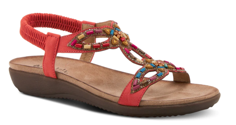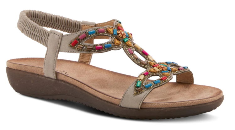 Dainty T-strap stretch back strap sandal featuring multicolored wooden barrel beads surrounded by rhinestones on a geometric cut out upper with two central flowers. The soft and cozy foot bed along with the flexible sole assures all day comfort.