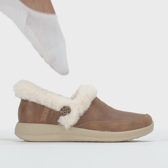 Cuddle up in comfort with Skechers Hands Free Slip-ins®: Cozy Escape. This casual slipper features a 3M® Scotchgard® treated vegan leather upper with faux fur trim, and a cushioned Skechers Memory Foam™ footbed.