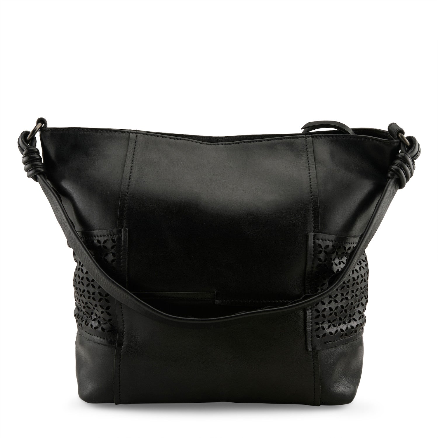This soft buttery genuine leather crossbody/shoulder Hobo style bag we call Smoochie says it all! Its deliciously soft and well…. Smoochie! Alternating petal-like geometric full front and side laser-cut patterns in a repeating diamond-flower motif give it a contemporary but slightly bohemian feel, while the smooth sections of leather keep it looking polished and professional. The adjustable detachable strap allows for a handsfree crossbody experience or wear her close to your body with our end knotted shorter shoulder strap. Single compartment interior with full walled zipper pocket and opposite dual open pouches.