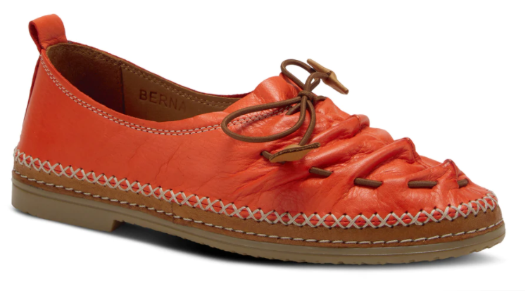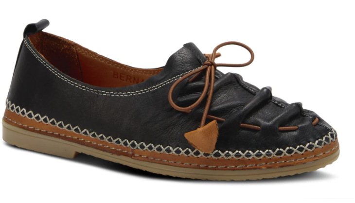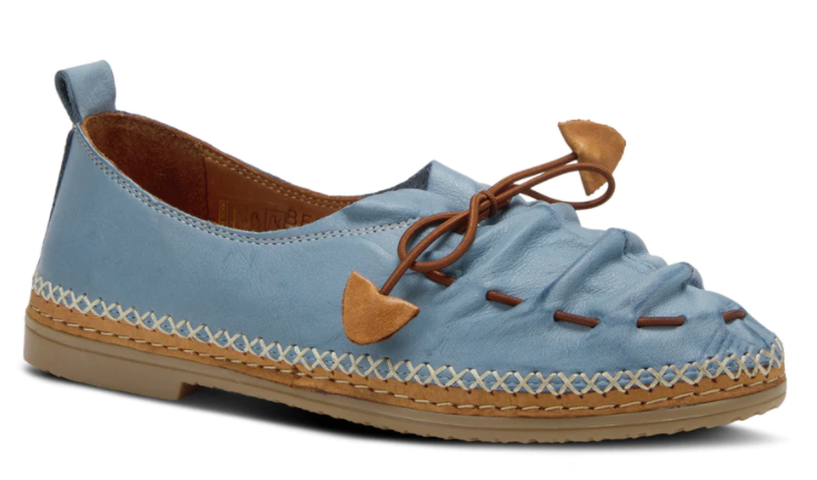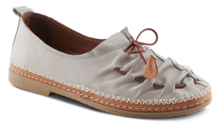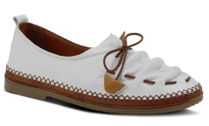 Trendy artistic slip-on shoe featuring an incorporated elastic vamp-tie and contrast whip-stitching.