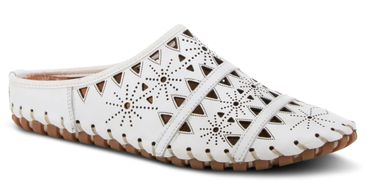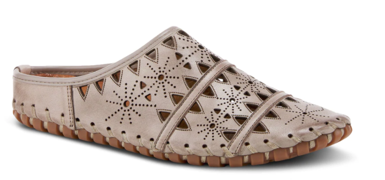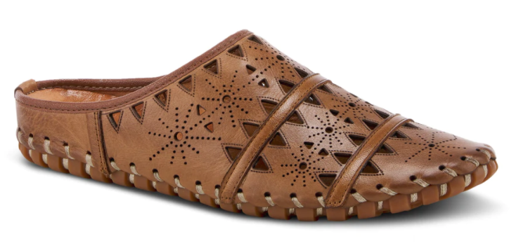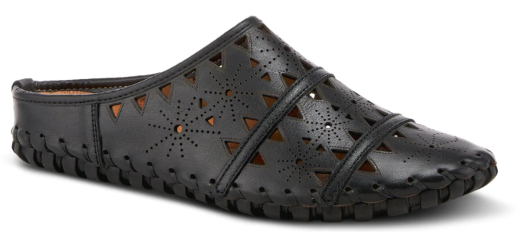 European influenced, leather open back slip-on shoe, featuring geometric laser cutouts and etching for a unique modern appeal all on a lightweight, durable, flexible, rubber sole for all day comfort.