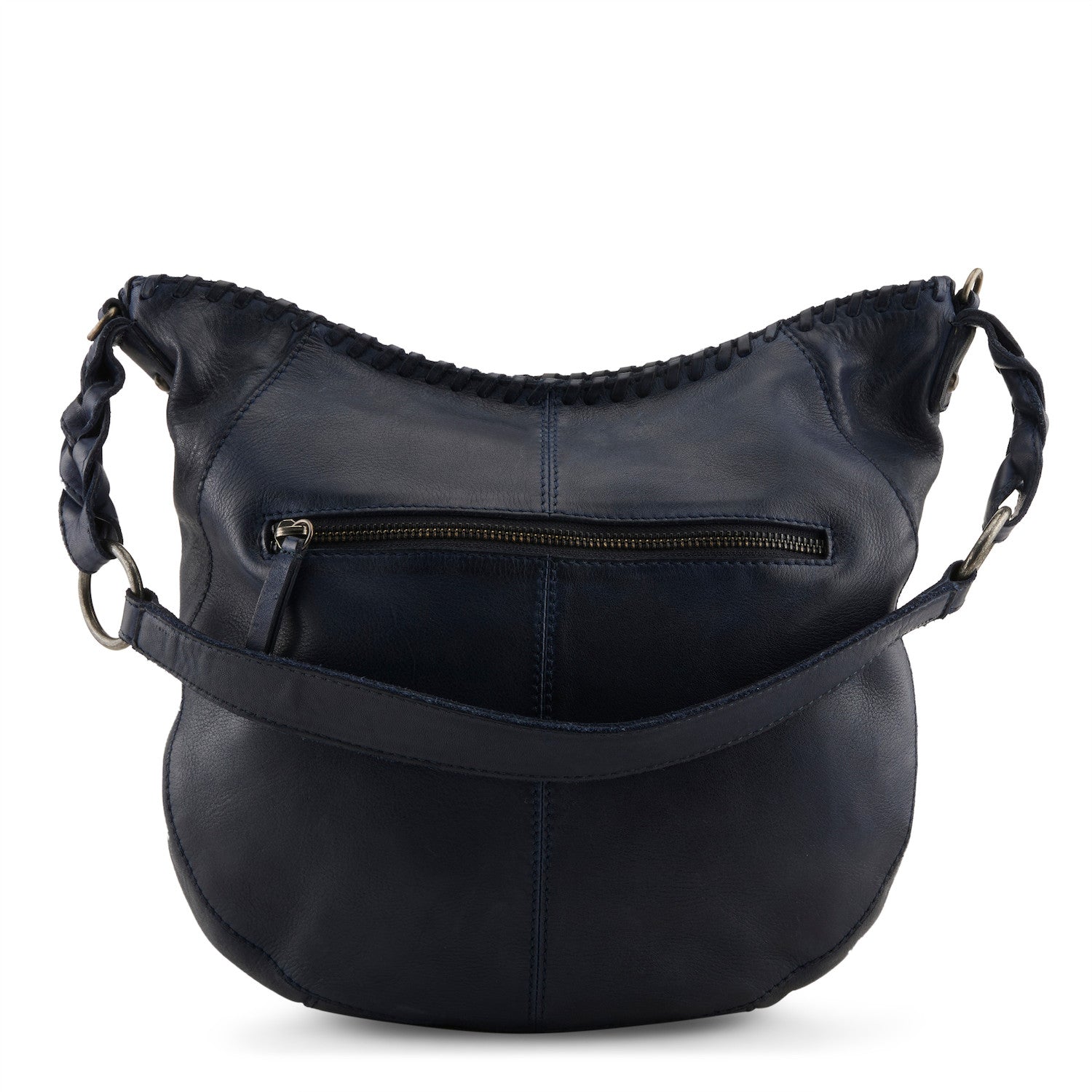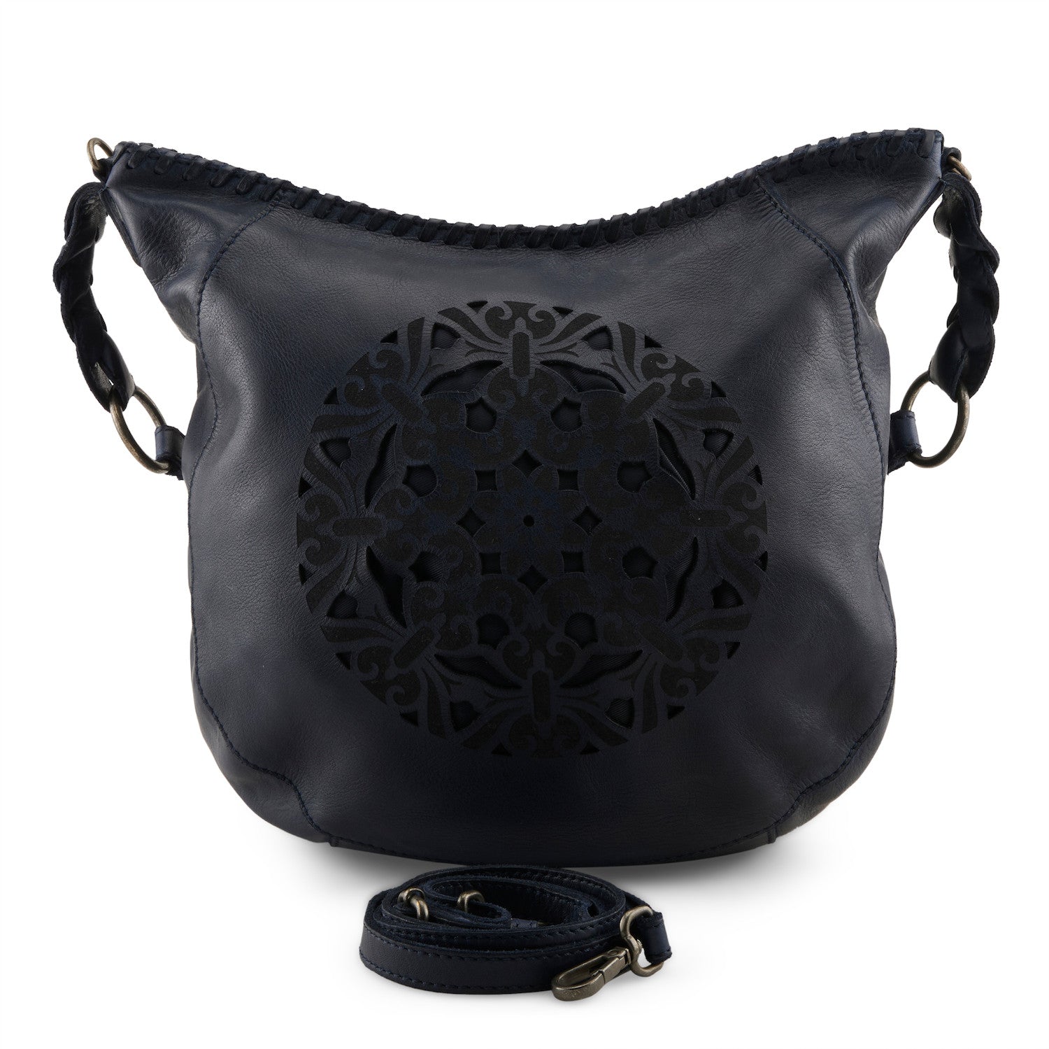 Dark rich butter soft navy leather hobo bag, with a relaxed comfy silhouette featuring a central striking laser-cut circular mandala pattern on the front, and a deep central zipper pocket on the back. Adding an additional touch of boho artistry, is the whipstitched leather trim along the top and braided strap attachments. Scoop zip top opens wide to a single cotton lined compartment with opposite zip and patch pockets for incidentals, and easy wearing options as either a close to the body shoulder bag or crossbodied with the adjustable detachable strap for hands free convenience.